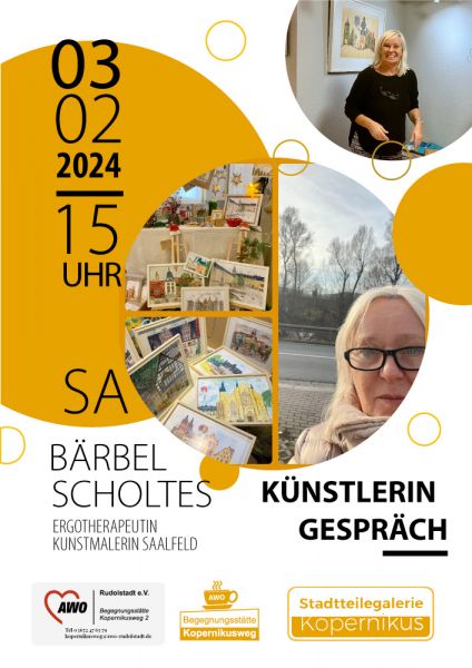 Die AWO-Begegnungsstätte Kopernikusweg lädt Sie herzlich ein, am Samstagnachmittag, den 03.02., um 15:00 Uhr, mehr über die Person und das künstlerische Schaffen der Saalfelder Kunstmalerin Bärbel Scholtes zu erfahren. Das Samstagscafé präsentiert ein Künstlerinnengespräch mit der lebensfrohen Kunstmalerin, die derzeit ihre aktuelle Ausstellung "VERWEILEN" in der Stadtteilegalerie Kopernikus präsentiert.