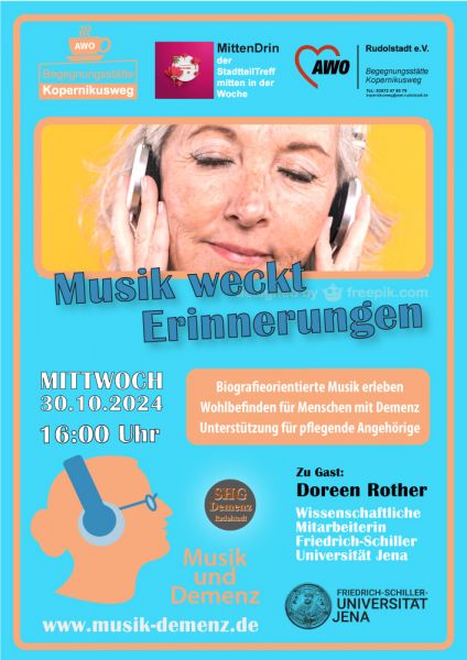 Entdeckt die Kraft der Musik bei Demenz! Am Mittwoch, den 30. Oktober 2024, um 16:00 Uhr lädt die AWO Begegnungsstätte Kopernikusweg in Rudolstadt zu einer besonderen Veranstaltung ein. Im Rahmen der „MittenDrin“-Reihe präsentiert das Team um Prof. Dr. Wilz von der Friedrich-Schiller-Universität Jena, wie biografieorientierte Musik das Wohlbefinden von Menschen mit Demenz fördern kann.