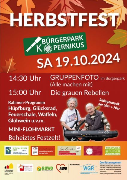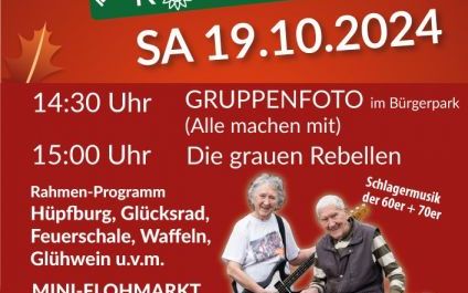 Am Samstag, 19. Oktober um 14:00 Uhr laden wir euch herzlich zum Herbstfest im Bürgerpark Kopernikus ein! Genießt Glühwein, Waffeln und Kuchen, während die kleinen Gäste sich auf der Hüpfburg austoben. Entdeckt den Miniflohmarkt und versucht euer Glück am Glücksrad. Ab 15:00 Uhr verzaubern euch „Die grauen Rebellen“ mit Live-Musik der 60er und 70er. Verpasst nicht das Gruppenfoto um 14:30 Uhr mit Else und Walter Rudolph, unserem charmanten Schlager-Duo! Kommt vorbei und feiert mit uns!