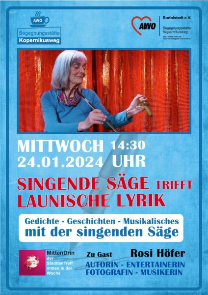 Die vielseitige Künstlerin Rosi Höfer aus Kahla, die durch ihre einzigartigen musikalischen Darbietungen mit der singenden Säge bekannt geworden ist, wird am kommenden Nachmittag ihr Publikum mit weiteren facettenreichen Talenten begeistern. Neben ihrer musikalischen Virtuosität tritt Rosi Höfer an diesem besonderen Tag auch als begabte Geschichtenerzählerin und einfühlsame Dichterin in Erscheinung.