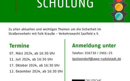 Am 07. März 2024 startet unsere Verkehrsteilnehmerschulung um 16:30 Uhr. Erfahre alle aktuellen und wichtigen Themen rund um sicheres Fahren mit Falk Krauße von der Verkehrswacht Saalfeld.