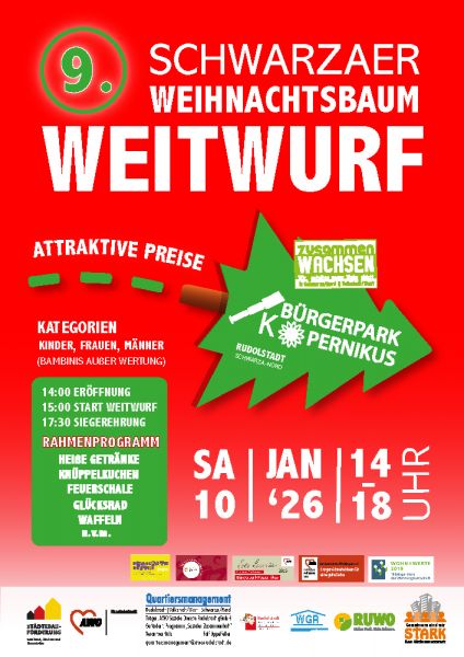 Am Samstag, den 4. Januar 2025, lädt der Bürgerpark Kopernikus in Schwarza Nord zum 8. Schwarzaer Weihnachtsbaumweitwurf ein – ein spaßiges Event für die ganze Familie. In den Kategorien Kinder, Frauen und Männer treten Teilnehmer*innen an, um ihre Wurfkraft zu messen und attraktive Preise zu gewinnen. Auch Bambinis kommen auf ihre Kosten und erhalten Gutscheine fürs Glücksrad. Besucher*innen können ihren eigenen Weihnachtsbaum zur Entsorgung mitbringen oder ihn im Vorfeld im Bürgerpark ablegen. Neben sportlichem Ehrgeiz sorgen Glühwein, herzhafte Speisen und Musik für eine gemütliche Atmosphäre. Seien Sie dabei, wenn Tradition, Nachhaltigkeit und Gemeinschaft aufeinandertreffen!