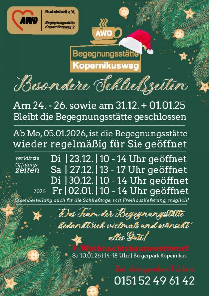Für weitere Informationen wenden Sie sich bitte an die AWO Begegnungsstätte Kopernikusweg oder das Seniorenbüro des Landkreises Saalfeld-Rudolstadt.