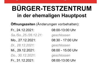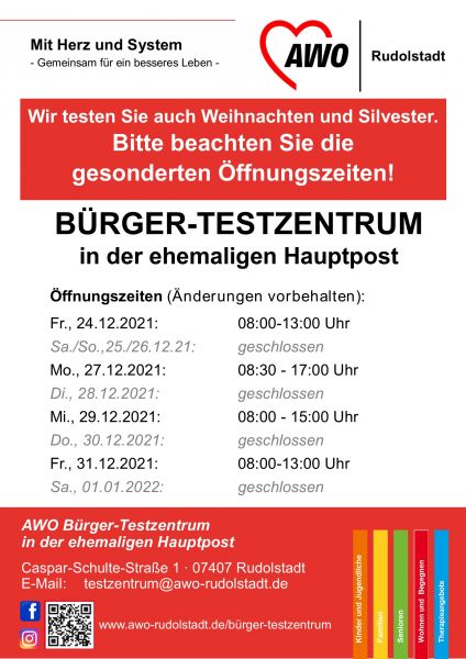 Für Ihre Planung möchten wir Ihnen schon heute sagen: Wir testen Sie auch an Weihnachten und Silvester. Bitte beachten Sie über die Feiertage die gesonderten Öffnungszeiten unseres Bürger-Testzentrums in der ehemaligen Hauptpost Rudolstadt.