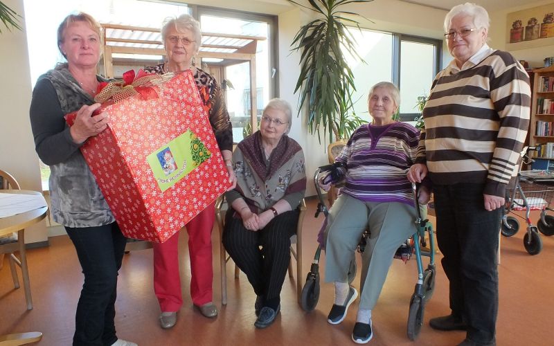 Geschenkübergabe im Seniorenheim Rudolstadt durch Frauen der Kreativgruppe und Frau Rosmarie Ziehr, Einrichtungsleiterin Begegnungsstätte Markt 8 (links)