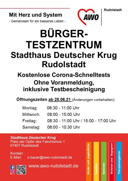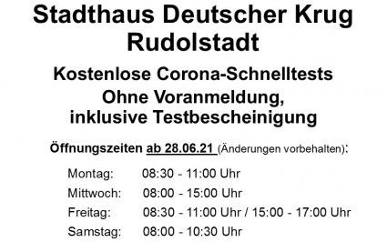 Unser Bürger-Testzentrum im Stadthaus Deutscher Krug Rudolstadt bleibt weiterhin geöffnet. Sie können sich täglich außer dienstags und sonntags kostenlos und ohne Voranmeldung auf das Coronavirus SARS-CoV-2 testen lassen.