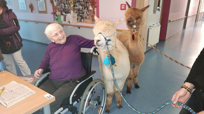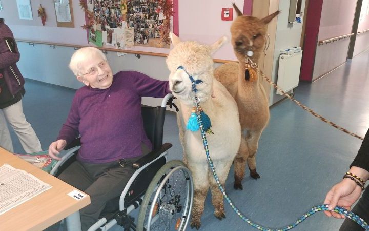 Dinters Therapieangebot hat die Königseer Senioreneinrichtung zum ersten Mal genutzt. „Aber fortan werden wir das regelmäßig tun“, bestätigt Katja Oswald, Leiterin des Sozialen Dienstes in der AWO-Senioreneinrichtung. Einmal im Quartal, so ist der Plan, sollen die Andenkamele die Bewohner/innen erfreuen und dabei therapieren. Und zwar alle! Auch jene, die beispielsweise nicht mehr das Zimmer verlassen können. Zu denen kommen die Alpakas dann einfach mit dem Fahrstuhl. Zimmer für Zimmer beglücken die Fellnasen alle Senior/innen.