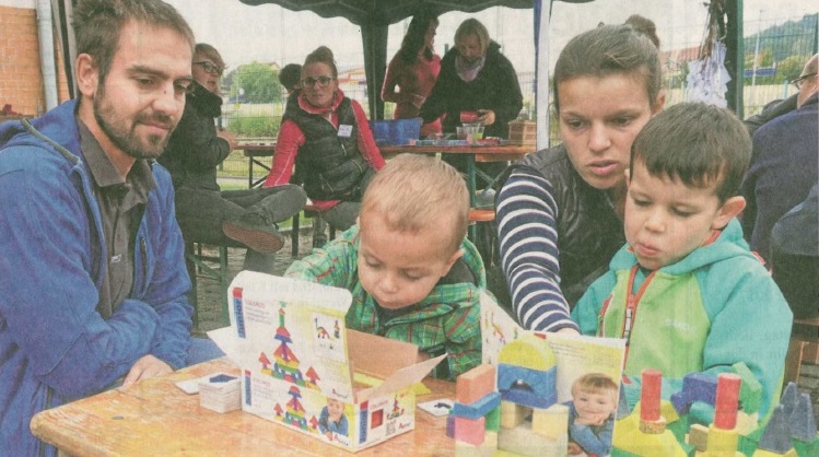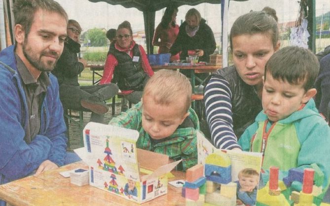 Emil (rechts) und Anton Glaser spielen mit ihren Eltern Anne und Martin beim Tag der offenen Tür auf dem Außengelände der Ankerstein GmbH. Das Unternehmen, das nach einem Eigentümerwechsel wieder an den alten Firmensitz im Industriegebiet Schwarza gezogen ist, konnte am Sonnabend bei Herbstwetter hunderte Besucher begrüßen. Familie Glaser aus Rudolstadt war bereits zum dritten Mal dabei, zwei Ankersteinbaukästen gehören auch zum Spielzeugarsenal zu Hause. Zu den weiteren Angeboten gehörten Hüpfburg, Turmbau aus Ankersteinen und Kinderschminken. Bei den Betriebsrundgängen in dem Fünf-Mann-Unternehmen bildeten sich Schlangen.