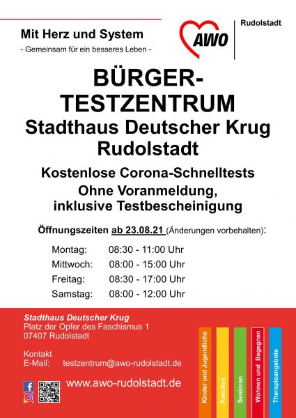 Insbesondere an Freitagen und Samstagen ist das AWO Bürger-Testzentrum im Stadthaus Deutscher Krug (Platz der Opfer des Faschismus 1, 07407 Rudolstadt) stark frequentiert. Um diesem Bedarf gerecht zu werden, reagiert der Verband mit einer Erweiterung der Öffnungszeiten an diesen Tagen: Am Freitag ist das Testzentrum ab sofort durchgängig in der Zeit von 8.30 Uhr bis 17 Uhr geöffnet; am Samstag von 8 bis 12 Uhr.