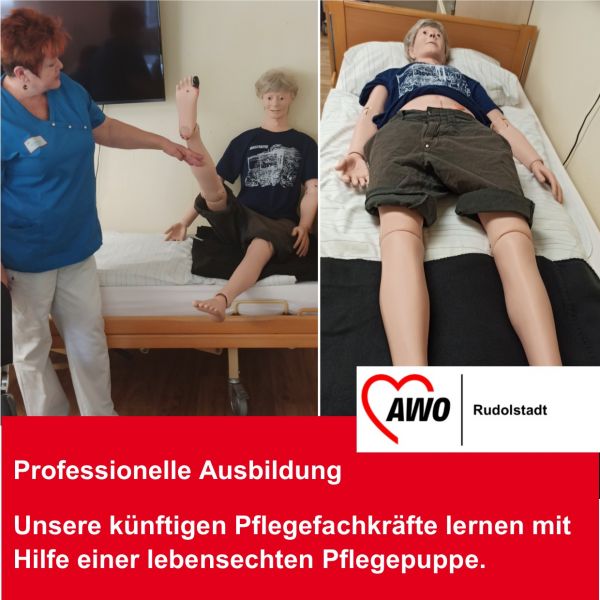 Die AWO Rudolstadt hat jüngst zwei Pflegeübungspuppen im Wert von je 2.500 Euro für die professionelle Ausbildung in unseren Senioreneinrichtungen in Rudolstadt und Königsee angeschafft. Die speziellen Pflegepuppen kommen in der Ausbildung unserer Pflegefachkräfte zum Einsatz und sehen aus wie ein Mensch und können auch nur wie ein solcher bewegt werden.
