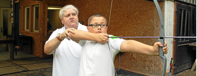 Trainerin Bärbel Sättler gibt Lucas Max Ulitzsch Tipps. Der 10-Jährige trainiert seit drei Jahren regelmäßig Bogenschießen beim PSSV Rudolstadt. Foto: Heike Enzian