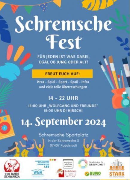 Nach fünf erfolgreichen Veranstaltungen erwartet euch am Samstag, den 14. September, ein unvergesslicher Festtag! Der kleine Umzug startet um 13:00 Uhr an der evangelischen Kirche St. Laurentius und führt zum Festplatz auf dem Schremschesportplatz. Bürger und Gruppen, die sich beteiligen möchten, sind herzlich eingeladen, sich um 12:30 Uhr an der Kirche einzufinden.