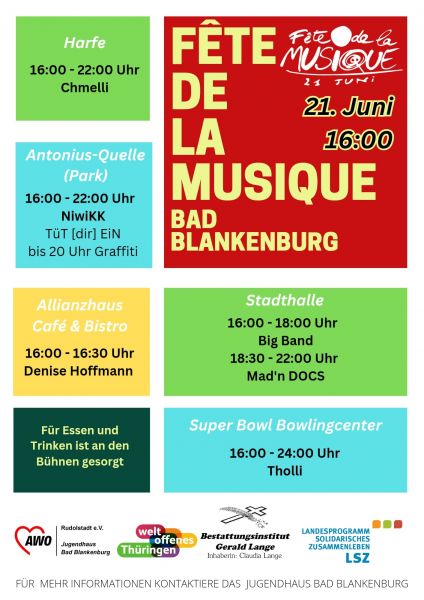 Das AWO Jugendhaus Bad Blankenburg freut sich, die dritte Ausgabe der "Fête de la Musique" zu veranstalten!