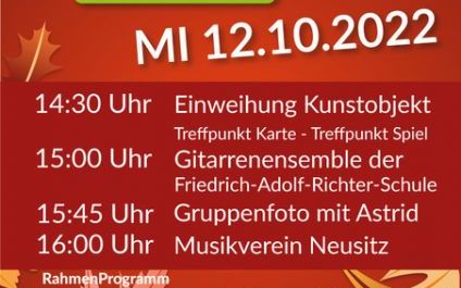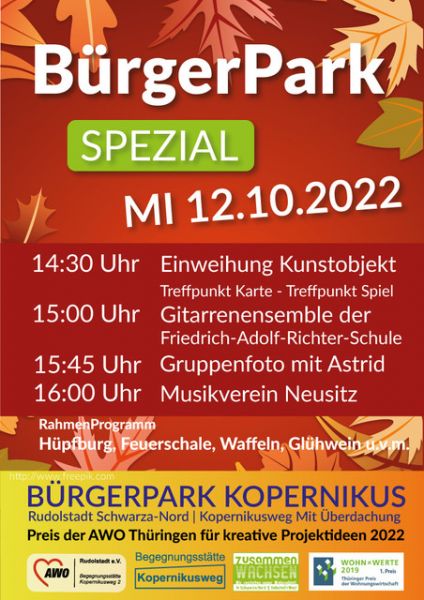 Das Bürgerparkteam lädt dazu herzlich ein und möchte sich mit einem kleinen Fest bei den beiden Künstlerinnen bedanken. Weiterhin soll mit allen Gästen die Würdigung durch den Landesverband der AWO Thüringen im Rahmen des alljährlichen AWO-Balls, am vergangenen Freitag, für kreative Projektideen für mehr Zusammenhalt, feiern. Dazu gibt es eine Darbietung des Gitarrenensembles der Friedrich-Adolf-Richter-Schule und des Musikverein Neusitz.