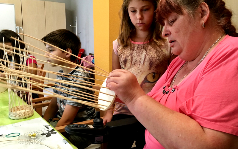 Unterstützung bekamen die Kinder auch von der über 80-jährigen Rosemarie Renner und Birgit Bär, die beide schon lange ihre Leidenschaft zum Flechten entdeckt haben. Die Erzieherin Frau Horn nutzte die Zeit um sich im Flechten mit kleinen Rollen aus Zeitungspapier zu üben. Diese Technik möchte Frau Horn in Zukunft in ihrer eigenen Einrichtung mit den Kindern weiter verfeinern. Nach über zwei Stunden konzentrierter Arbeit schöpften sich alle auf der wunderschönen neu eingerichteten Terrasse bei Limo, Melone und selbstgebackenen Kuchen. Trotz Altersunterschied kamen spannende Gespräche zu Stande, bevor wieder weitergearbeitet wurde.