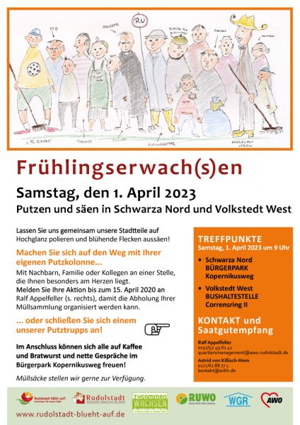 Ob direkt vor oder hinter dem Wohnblock oder einer ganz anderen Ecke irgendwo im Wohnquartier - werden Sie aktiv und lassen Sie unsere beiden Stadtteile vom winterlichen Schmutz und Dreck befreien. Organisieren Sie sich selber oder melden Sie sich zur Koordinierung beim Quartiersmanager der AWO Rudolstadt, Ralf Appelfeller unter der Nummer 0151 52 49 61 42 an. Hier erhalten Sie auch Müllbeutel und Saatgut zum aussähen, damit unsere Stadtteile im Sommer erblühen. Auch der Abtransport der vollen Müllsäcke wird organisiert. Zum Abschluss können sich alle Aktiven im Bürgerpark Kopernikus ab 12:00 Uhr bei Kaffee und Bratwurst austauschen.
