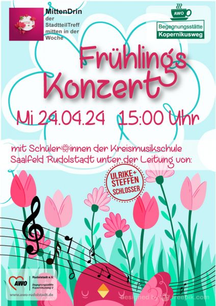Am Mittwoch, den 24. April um 15:00 Uhr lädt der Stadtteiltreff „Mittendrin" herzlich zu einem musikalischen Highlight in der AWO-Begegnungsstätte Kopernikusweg ein. Erleben Sie die talentierten Schülerinnen und Schüler unter der Leitung von Ulrike und Steffen Schlosser, wie sie mit ihren Darbietungen das kulturelle Leben im Stadtteil Schwarza-Nord bereichern.