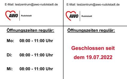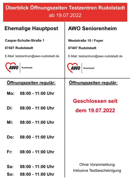 Bitte beachten Sie, dass das Testzentrum im AWO Seniorenheim Rudolstadt ab Dienstag, den 19.07.2022 geschlossen hat.