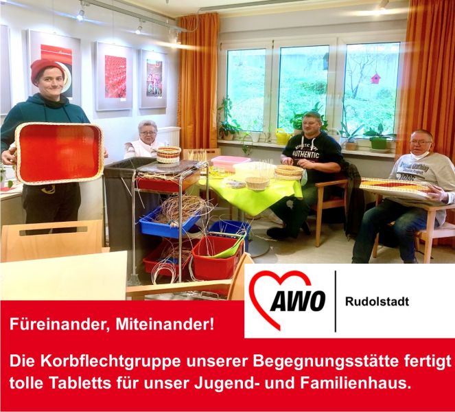 Echte Hingucker sind die Tabletts geworden, die die Korbflechtgruppe der AWO-Begegnungsstätte im Koperinkusweg ganz speziell für das Team des AWO Jugend- und Familienhaus Rudolstadt angefertigt hat. Michael Baldrich vom Jugendhaus (links) bedankte sich jüngst für die tollen Arbeiten der Flechtgruppe, die übrigens schon seit über sechs Jahren unter der Anleitung von dem Korbflechtexperten Frank Brömel (3. v.l.) die tollsten Kreativarbeiten fertigt. Wenn auch Sie Lust haben, sich am Peddigrohr auszuprobieren, dann kommen Sie doch einfach mal vorbei. Treffpunkt ist immer donnerstags von 10-13 Uhr in der Begegnungsstätte. Und wenn Sie nicht so die Ausdauer besitzen, aber vielleicht noch ein Weihnachtsgeschenk benötigen, dann können Sie die Korbarbeiten der Gruppe auch käuflich erwerben. Sogar Reparatur- und Auftragsarbeiten sind nach Absprache möglich.