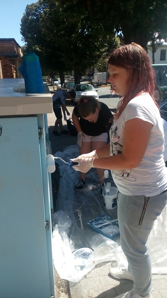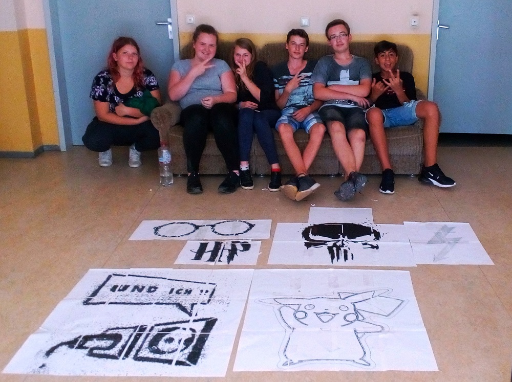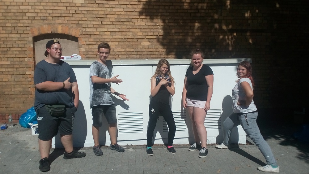Seit 6. August beschäftigten sich Johanna (14), Schirin (12), Sarah (14), Colin (14), Lenny (14) und Wadia (12) mit dem Projekt. Am ersten Tag wurden die Bilder, Schriftzüge und Motive entworfen und erstmals die Trafostation gemeinsam besichtigt. Sofort wurde begonnen die komplette Fläche zu weißen und zu grundieren. Am Dienstag war die Truppe in Leipzig, um dort die benötigten Sprühdosen zu erwerben, die legalen Sprühflächen in Connewitz – Leipzig zu besichtigen und sich mit dem einen oder anderen Sprayer auszutauschen. Am Mittwoch wurden die Motive vergrößert und die ersten Schablonen für das Sprühen entwickelt. Die Zeit reichte sogar aus, um gleich noch die Hintergrundfarben an die Trafostation zu sprühen. Der vierte Tag war geprägt von Ausschneidearbeiten. Alle Schablonen, insgesamt 18, mussten entsprechend ausgeschnitten und vorbereitet werden. Gestern war es dann endlich soweit. Die Schablonen wurden an die Wand gebracht, die Motive gesprüht, die Konturen gezogen und versiegelt.