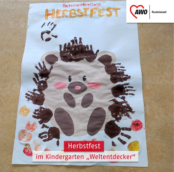 Das diesjährige Herbstfest des AWO Kindergartens „Weltentdecker“ drehte sich um die Tiere des Waldes und wie sie sich auf den Winter vorbereiten. Alle fressen nochmal ganz viel, damit sie dick und rund werden. Das Eichhörnchen Nüsse und Samen, der Igel Obst, Pilze und Schnecken und das Wildschwein mag alles, sogar Eicheln und Kastanien, deshalb ist es ein Allesfresser, so wie wir Menschen. Mit einem saisonalen Frühstück, Eichhörnchen-Sport, Rätselspielen und Farbabdrücken zu einer Gemeinschaftsarbeit, war es ein buntes, vielseitiges und fröhliches Fest. Leider musste wegen des Regens alles im Haus organisiert werden. So gab es in jedem Raum ein tolles Angebot, das die Kinder am Vormittag individuell nutzen konnten.