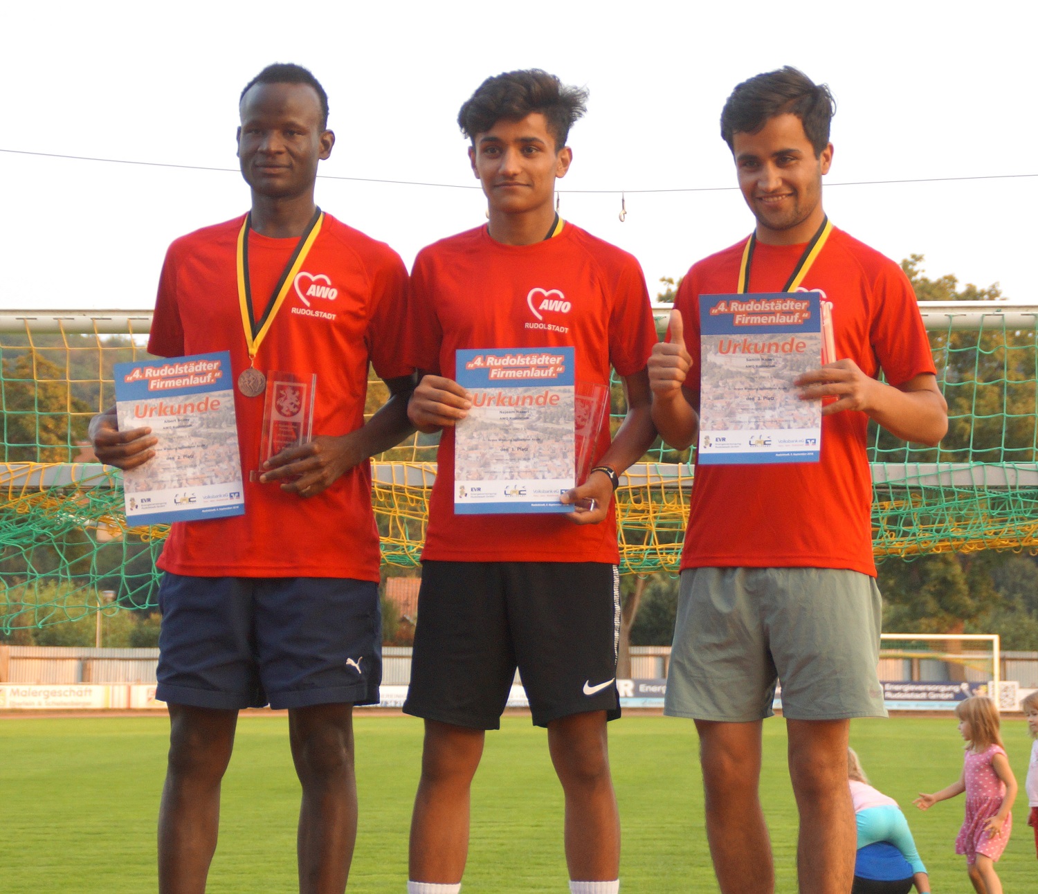 Auch in diesem Jahr war die AWO Rudolstadt wieder mit einer großen Anzahl an lauffreudigen Teilnehmern am Start. 13 Frauen und 10 Männer folgten dem Aufruf und liefen in den Kategorien Mitarbeiter und Auszubildende mit. In der Kategorie „Schnellster Azubi“ schafften es 4 männliche von unseren insgesamt 9 gemeldeten Auszubildenden die ersten Plätze zu belegen. Von unserer Seite ein ganz großes Dankeschön für den eifrigen Einsatz und dieses hervorragende Ergebnis! Wir hoffen, dass auch im nächsten Jahr wieder an die Leistung angeknüpft werden kann. (1. Platz: Najeem Nazari; 2. Platz: Albert Beimy; 3. Platz: Samim Nazari)