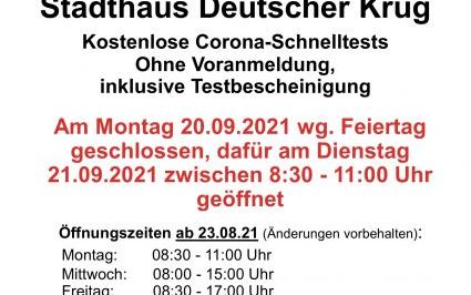 Wir weisen darauf hin, dass unser Testzentrum am 20. September 2021 wegen des Feiertags geschlossen bleibt. Dafür öffnen wir am Dienstag, den 21. September, in der Zeit zwischen 8:30 - 11:00 Uhr.