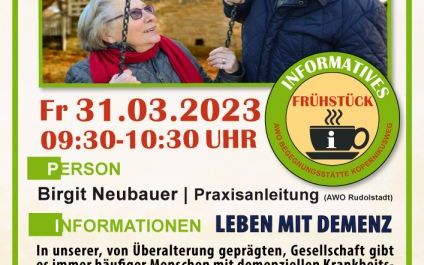 In unserer überalterten Gesellschaft beobachten wir einen Anstieg an Betroffene mit demenziellen Krankheitsbildern. Die Praxisanleiterin der AWO Rudolstadt gibt in ihren Vortrag wichtige Informationen zum Krankheitsbild, sowie mögliche unterstützende Umgangsstrategien. Dies soll der Auftakt für eine regelmäßige, monatliche Informations- und Austauschrunde zu diesem Thema in der Begegnungsstätte werden. Anmeldung ist nicht erforderlich.