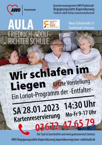 Mit der letzten Vorstellung ihres erfolgreichen Loriotprogramms möchten sich die Entfalter bei allen bedanken, die ihnen die letzten Jahre geholfen und die Treue bewahrt haben. Die Veranstaltung findet am Samstag, dem 28. Januar im Zeitraum von 14:30 Uhr bis 16 Uhr in der Aula der Friedrich-Adolf-Richter-Schule der AWO Rudolstadt statt.
