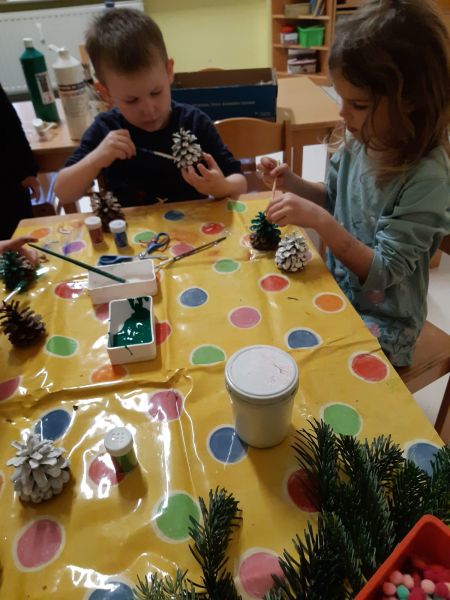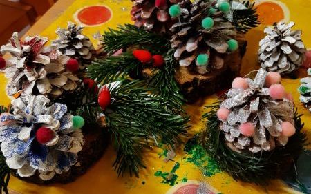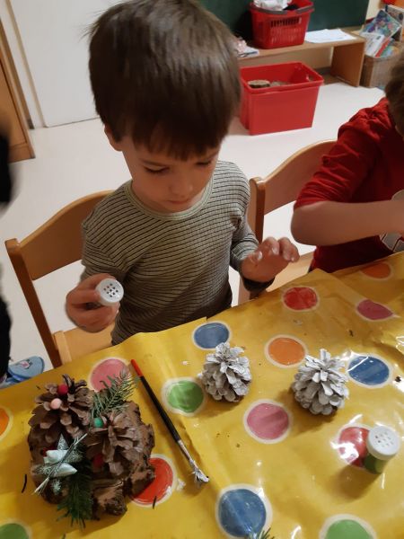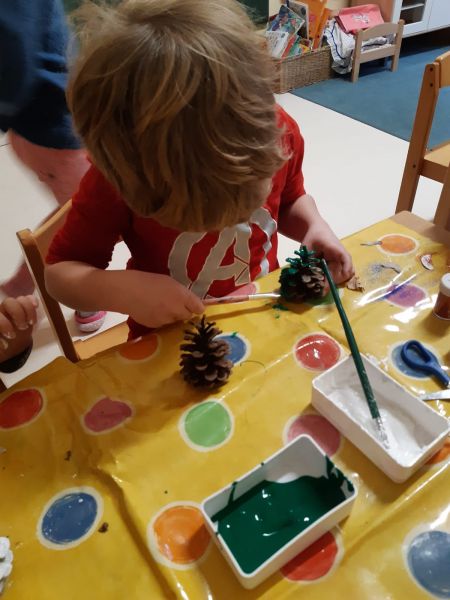 Im Kindergarten Feste Burg wurden fleißig kleine Tannenbäume aus Zapfen gebastelt. Die bunten Kunstwerke sind echte Hingucker.