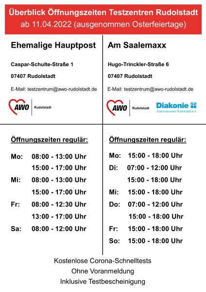 Ab Montag, den 11.04.2022, werden im Bürger-Testzentrum in der ehemaligen Hauptpost, Caspar-Schulte-Straße 1 in Rudolstadt sowie im Bürger-Testzentrum am Saalemaxx Freizeit- und Erlebnisbad Rudolstadt die Öffnungszeiten geändert.