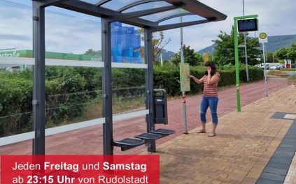 Nicht vergessen – jeden Freitag und Samstag verkehrt ab 23:15 Uhr ein Rufbus von Rudolstadt nach Remda und Teichel. Die Anmeldung muss bis spätestens Freitag, 15 Uhr unter dem KomBus-Servicetelefon 03671 / 52 51 999 angemeldet werden. Der Kleinbus mit einem Platzangebot von maximal acht Personen fährt über die Ortschaften Schaala, Eichfeld, Keilhau, Lichstedt, Groschwitz, Sundremda, Remda, Eschdorf, Heilsberg, Teichröda und Teichel.