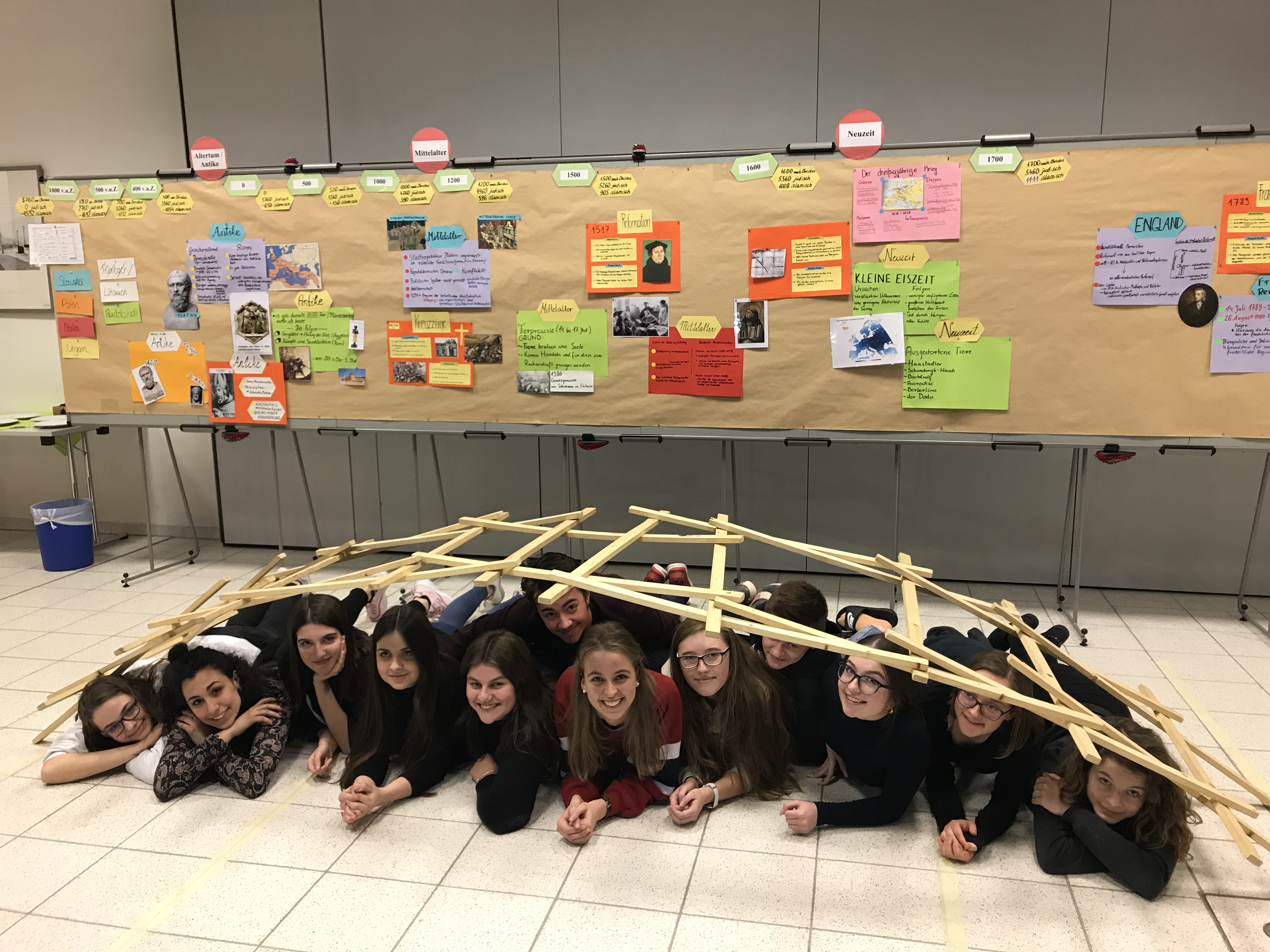 In den folgenden Tagen arbeiteten die Jugendlichen in national gemischten Gruppen zu den Themen Bildung, Werte, Demokratie, Menschenrechte, Krieg, Frieden, Ökonomie und Ökologie. Es entstand ein mehr als 10 m langer Zeitstrahl, in den die Arbeitsergebnisse der Gruppen eingebunden waren. Ein tieferer Einblick in die Knotenpunkte der europäischen Geschichte wurde ermöglicht und historische Zusammenhänge für die Beteiligten sichtbar. In der zweiten Wochenhälfte beschäftigten die Jugendlichen sich mit Utopien und möglichen Lösungen für die drängenden Fragen unserer Zeit. So entstanden optimistische Zukunftsgeschichten für ein gemeinsames Europa 2040, deren Lesung den Abschluss des Treffens bildete. Die Schulbrücke Europa wird maßgeblich durch den Stil und die Arbeitsweise von Frithjof Reinhardt geprägt, der von den Teilnehmenden inhaltlich viel abfordert, ihnen gehaltvolle Aufgaben zumutet und damit bewirkt, dass so mancher in den Tagen über sich hinauswächst und durch das Zusammenwirken aller beeindruckende Arbeitsergebnisse entstehen.