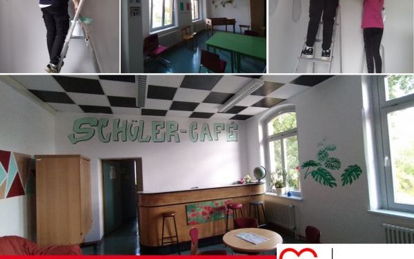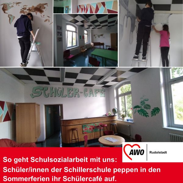 Alles neu macht nicht der Mai, sondern Schüler/innen der Regelschule "Friedrich Schiller" in Rudolstadt während ihrer Sommerferien. Genauer: ihr Schülercafé. Gemeinsam mit ihrer Schulsozialarbeiterin der AWO Rudolstadt gingen vier Schüler/innen die Renovierung des Cafés an - angefangen mit der gründlichen Planung und Beschaffung von Farben und Motiven bis hin zum Malern und Gestalten. Im Ergebnis steht nun ein freundlich-frischer Raum zum Chillen und Chatten. Na dann kann das neue Schuljahr ja kommen.