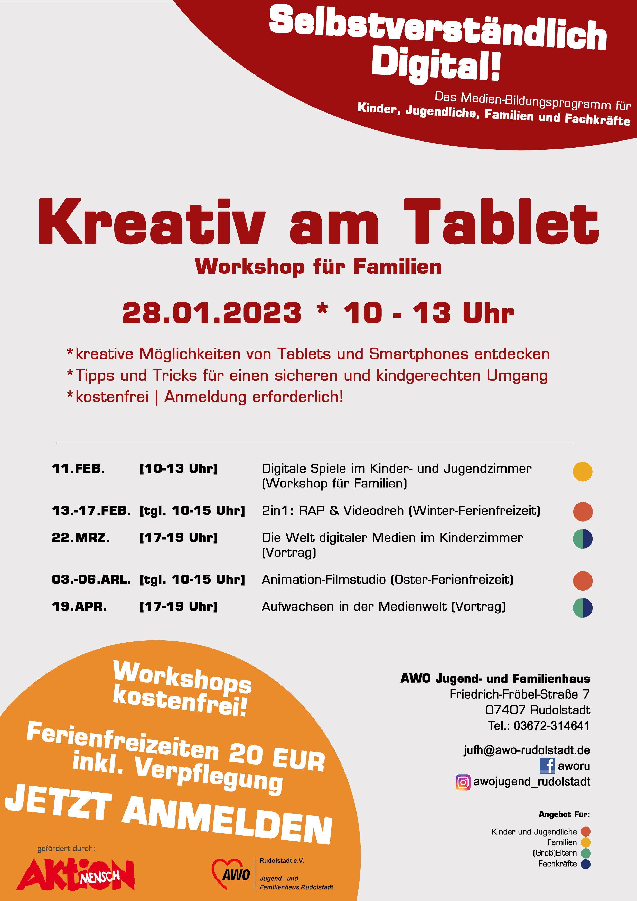 Das gesamte Programm findet ihr unter www.awo-rudolstadt.de/jfh-neues. Neben Workshops zu Spielen und Vorträgen zur Medienwelt von Kindern und Jugendlichen, finden auch zwei Ferienfreizeiten mit dem Schwerpunkten Musik & Videodreh und Film-Animation statt.