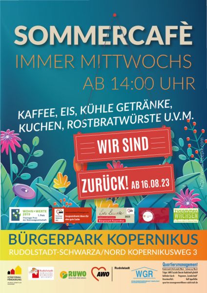 Das SOMMERCAFÈ im Bürgerpark Kopernikusweg startet nach der Sommerpause ab jetzt wieder zuverlässig jeden Mittwoch ab 14:00 Uhr.