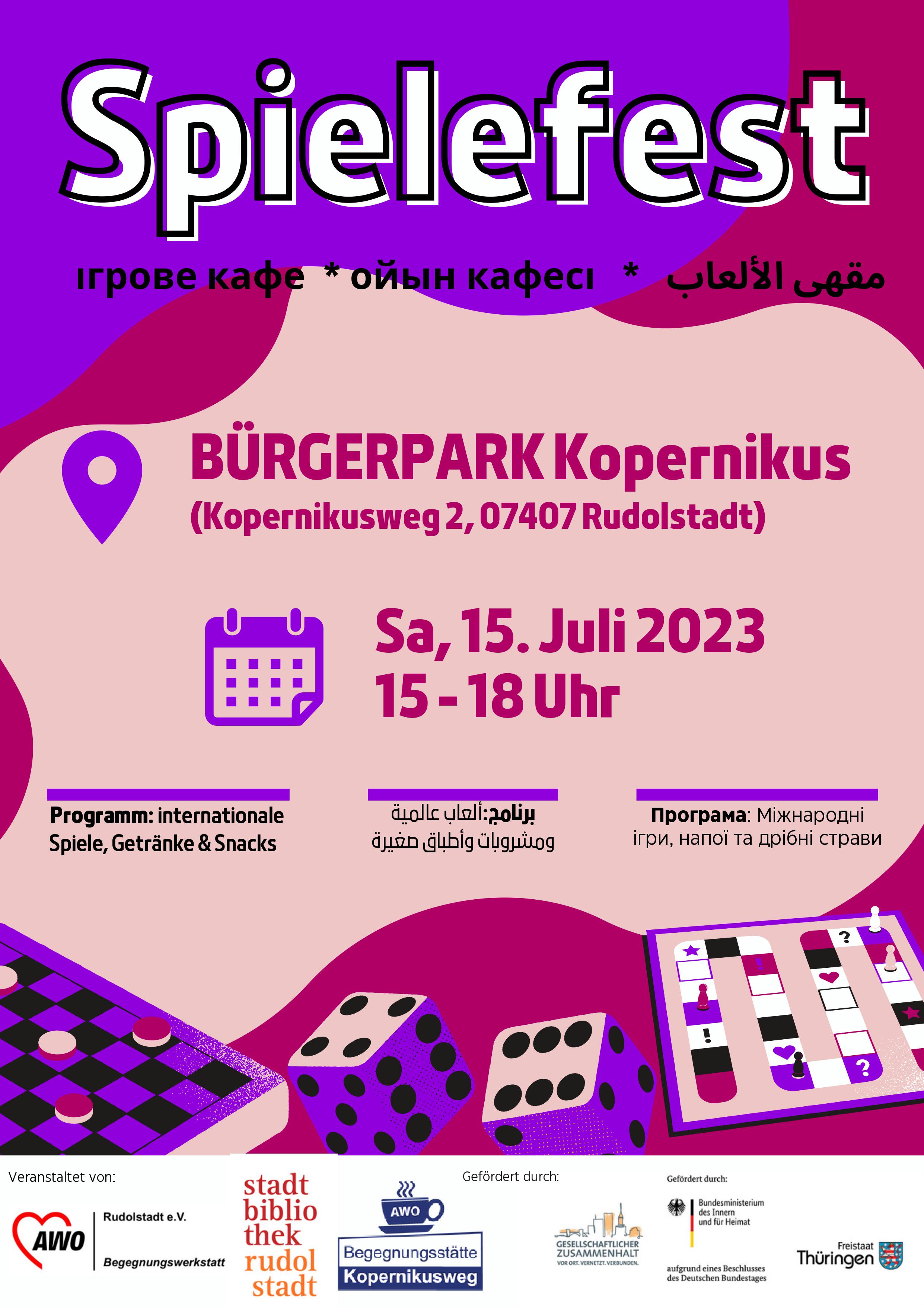 Am Samstag, den 15. Juli 2023, ab 15:00 Uhr startet im Bürgerpark Kopernikus in Schwarza-Nord ein kleines Spielefest für „Jung und Alt“.