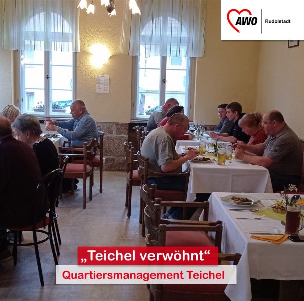 Um die seit vielen Jahren leerstehende Gaststätte im historischen Rathaus zu Teichel etwas wiederzubeleben, wurde vom Quartiersmanagement Teichel der AWO Rudolstadt am 29.4.23 erstmals eine Veranstaltung namens „Teichel verwöhnt“ organisiert. Die Idee dahinter war, dass die Teicheler und ihre Gäste in der Gaststube ein 3-Gänge-Menü genießen können, das von einem extra engagierten Leihkoch kreiert worden wäre.