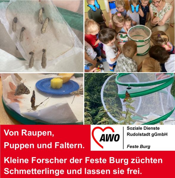Tierisch ging es diese Woche in unserem Kindergarten Feste Burg zu: Dort hielten nämlich sechs kleine Raupen Einzug. Im Rahmen des Schmetterlingsprojektes wurden diese zunächst einmal gefüttert, damit sie groß und stark werden. Als Puppen im Kokon schliefen sie schließlich eine Woche lang, um dann übers Wochenende als Schmetterlinge zu schlüpfen. Diese hatten dann groooßen Hunger und für die Kinder war es sehr aufregend, sie beim Fressen zu beobachten. Gut gestärkt hieß es dann Abschied nehmen: In der Natur verabschiedeten sich die Kinder von den hübschen Faltern und wünschten ihnen eine gute Reise.