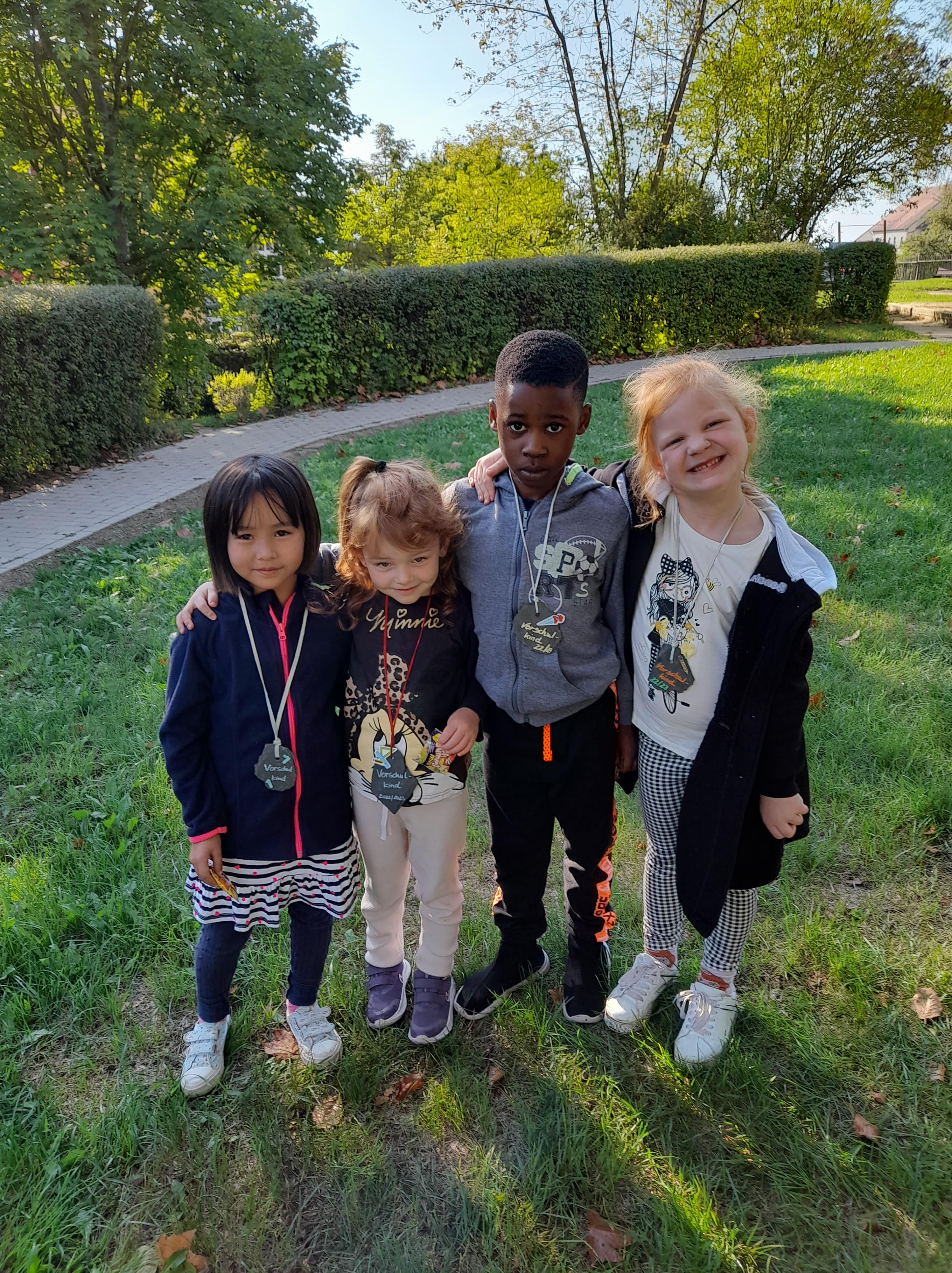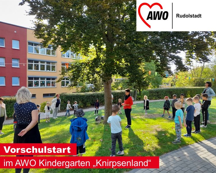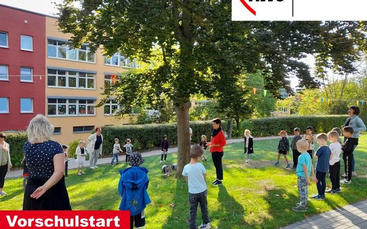 30 Vorschulkinder aus 6 verschiedenen Gruppen aus dem AWO Kindergarten Knirpsenland plus ihre Erzieherinnen trafen sich am Montagmorgen im Garten des Knirpsenlandes. Frau Matiss, Einrichtungsleiterin des Kindergartens, läutete das letzte Kindergartenjahr unserer aktuellen Vorschüler offiziell ein, indem Sie ein paar persönliche Worte an die Kinder richtete, zu einem gemeinsamen Mitmachlied einlud und zum Abschluss jedem Kind eine Medaille aus Schiefer zum Vorschulstart überreichte.