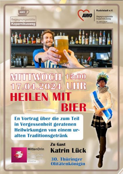 Die AWO-Begegnungsstätte Kopernikusweg und der StadtteilTreff Mittendrin laden herzlich zu einem interessanten Vortrag ein: "Heilen mit Bier - Eine verkannte Tradition". Dieser Vortrag findet am Mittwoch, den 17. April, um 15:00 Uhr statt und verspricht eine Reise in die Welt der heilenden Wirkung des Bieres.