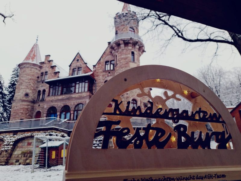 Winterliche Grüße sendet das Team des Kindergartens Feste Burg! Herzlichen Dank an das AGH-Team der Handwerkskammer Ostthüringen für den zauberhaften Schwippbogen, der unsere Burg nun in der besinnlichen Weihnachtszeit liebevoll schmückt.