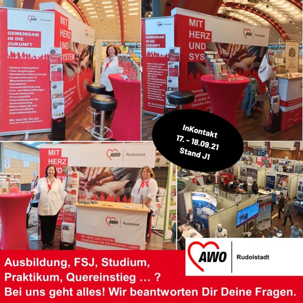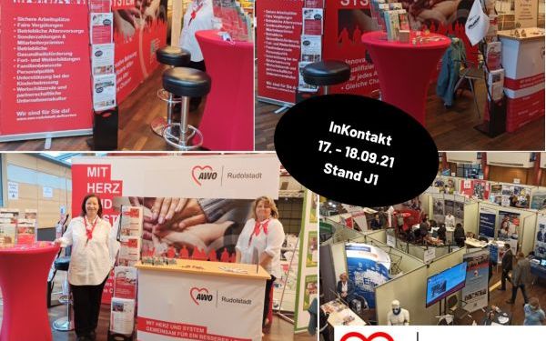 Die AWO Rudolstadt präsentiert sich am 17. und 18. September 2021 auf der Ausbildungsmesse InKontakt in Bad Blankenburg. Am Stand J1 beantworten Mitarbeiter/innen unserer Personalabteilung alle Fragen zu einer Ausbildung, einem Praktikum oder FSJ, einem dualen Studium oder auch zum Thema Quereinstieg bei uns.