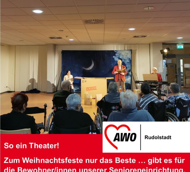 "Die Nacht der Nächte - Zum Weihnachtsfeste nur das Beste!" Der Titel des literarisch-musikalischen Theaterstücks ist Programm. Denn: Für die Bewohner/innen unserer Rudolstädter Senioreneinrichtung soll's natürlich nur das Beste geben; erst recht zu Weihnachten. Erst recht, wenn Corona die Zeit mal wieder etwas schwerer macht. Also besuchte vergangene Woche ein Ensemble des Theater Rudolstadts unsere Senior/innen und brachte einen Sack voller Geschichten, Gedichte und Lieder zur Weihnachtszeit mit. Von komisch bis skurril, von heiter bis nachdenklich. Und so weihnachtete es im Seniorenheim und der Alltag geriet mal bisschen in den Hintergrund ...