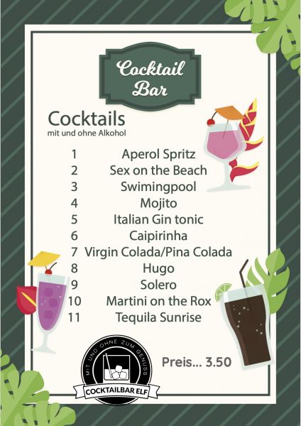 Der Name ist Programm: Wir bieten elf verschiedene Cocktails an – jeden davon konsequent in einer Variante mit und ohne Alkohol.