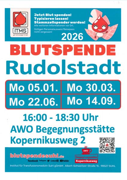 In Zusammenarbeit mit dem ITM Suhl lädt die Begegnungsstätte viermal im Jahr zur Blut- und Plasmaspende ein. In Zeiten des demografischen Wandels ist jede Spende ein besonders wertvoller Beitrag für die medizinische Versorgung in unserer Region.